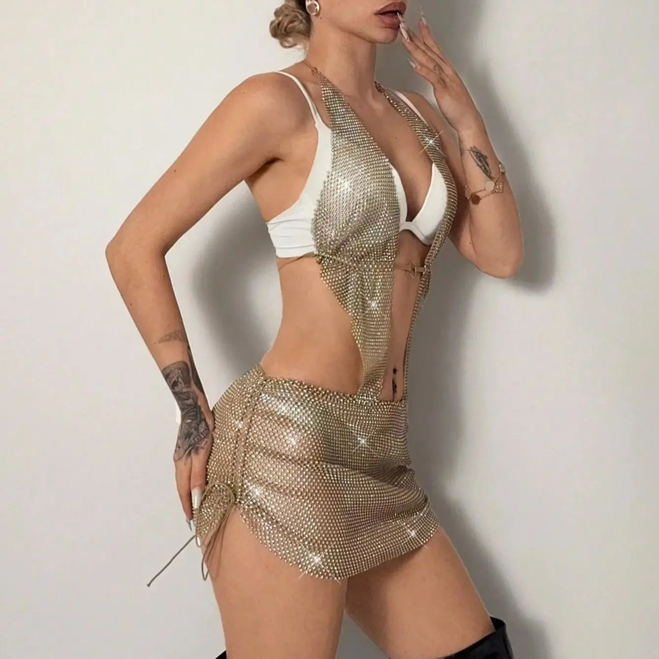 Make a bold statement with the Gia Mini Diamante Dress. This nude-colored halter mini dress features sparkling rhinestone mesh and scrunch sides that contour your figure. The delicate mesh chain detail adds edgy glamour, making it the perfect choice for unforgettable nights out or clubbing in style. Made To Order.